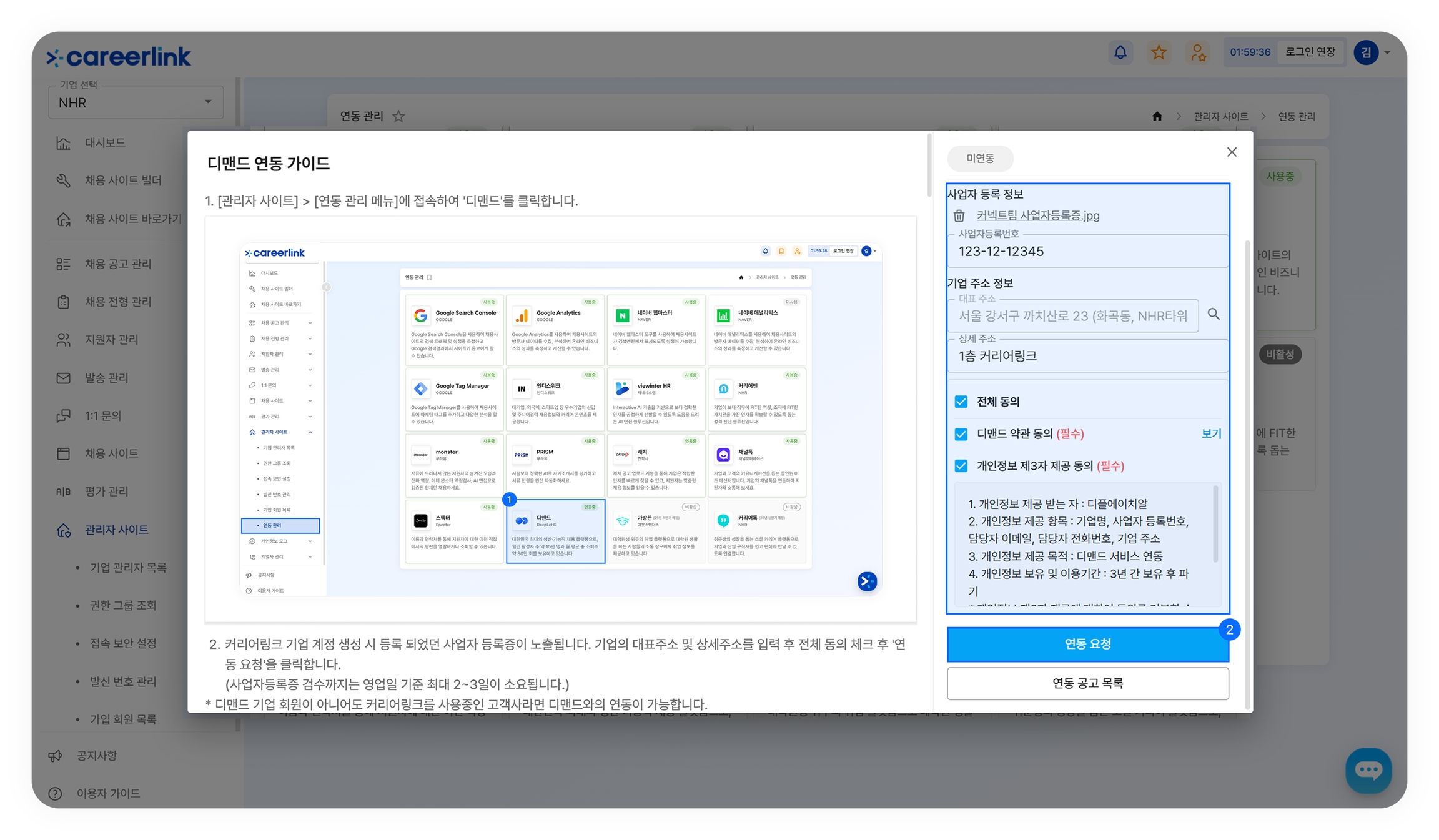 ❷ 커리어링크 기업 계정 생성 시 등록 되었던 사업자 등록증이 노출됩니다. 기업의 대표주소 및 상세주소를 입력 후 전체 동의 체크 후 '연동 요청'을 클릭합니다. (사업자등록증 검수까지는 영업일 기준 최대 2~3일이 소요됩니다.)