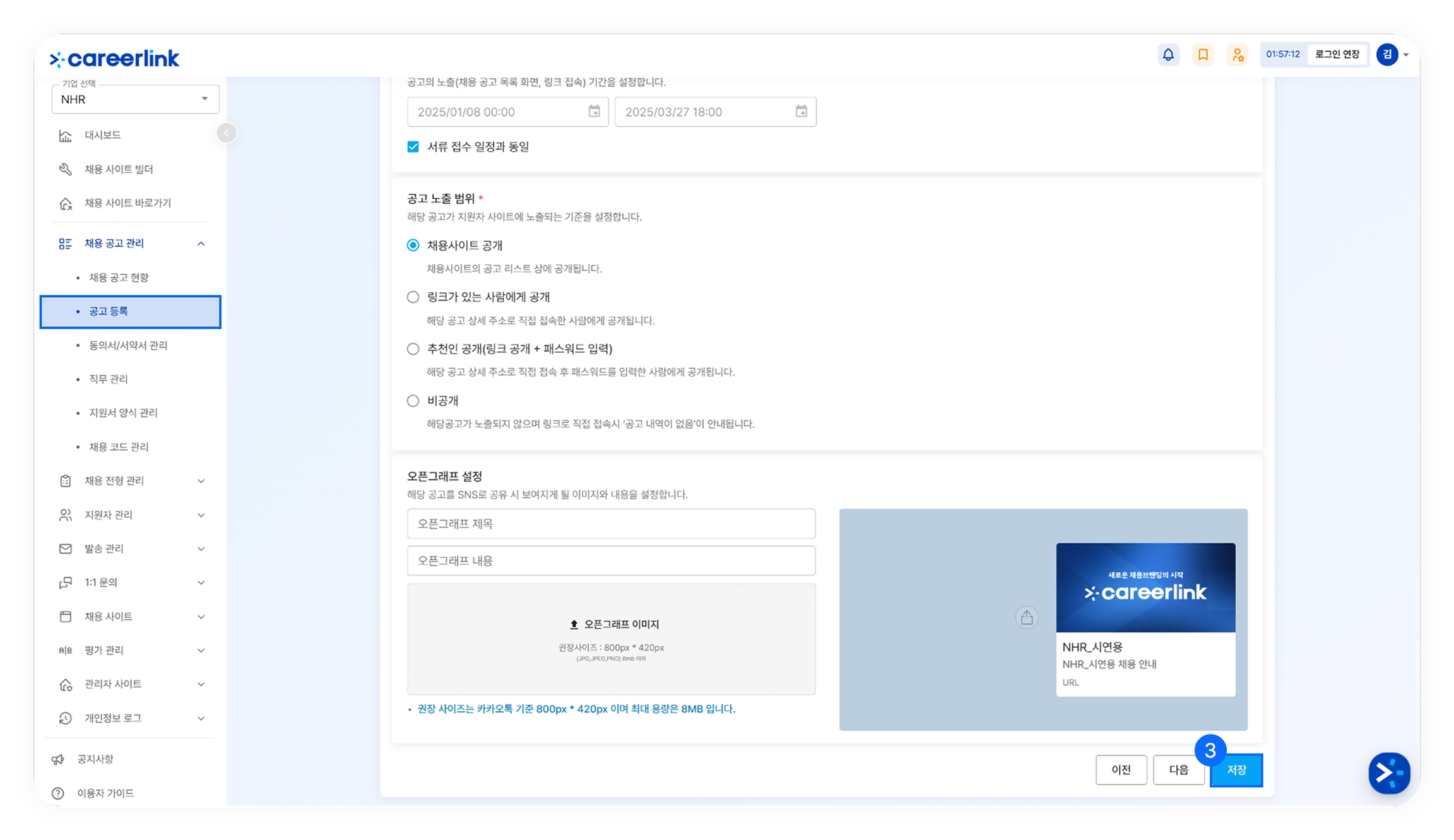 ❸ [채용 공고 관리] > [공고 등록]에서 신규 공고를 등록하거나 [채용 공고 관리] > [채용 공고 현황]에서 기존에 사용한 공고를 수정합니다. '저장'버튼 클릭 후 '공고를 홍보하시겠습니까?' 라는 안내메세지가 나오면 '예'를 클릭하고 '디맨드'를 클릭합니다.