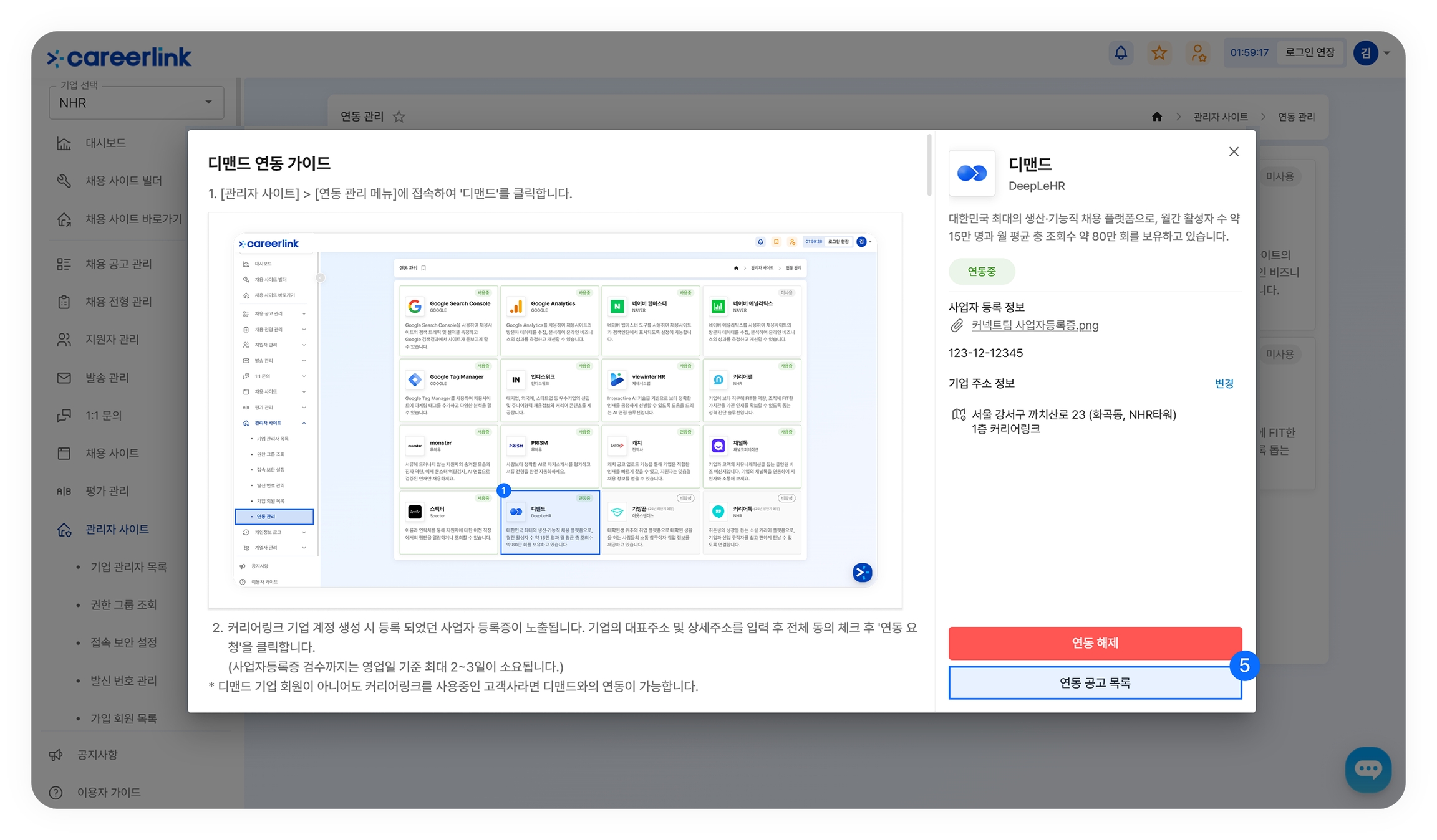 ➐ 연동 해제 버튼을 눌러 디맨드와의 연동을 해제할 수 있습니다. 커리어링크 기업 계정을 삭제 할 경우, 계정 연동이 해제됩니다.
