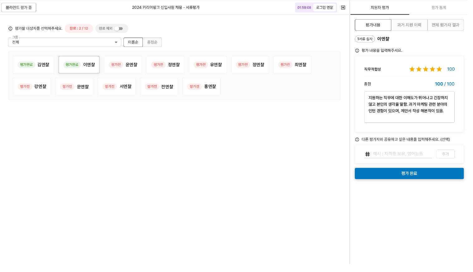 평가자는 평가한 지원자들의 현황을 직무별로 모아 볼 수 있습니다.