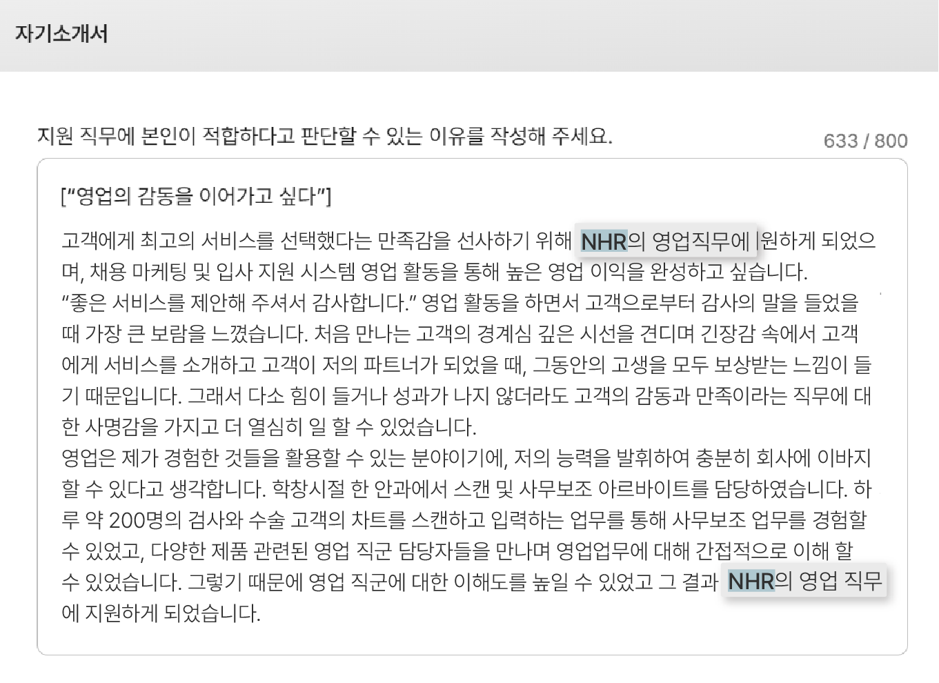 ex) 'NHR' 금칙어 설정 시 지원서의 자기소개서, 경력기술서에 특정 키워드가 강조되어 표시됩니다.