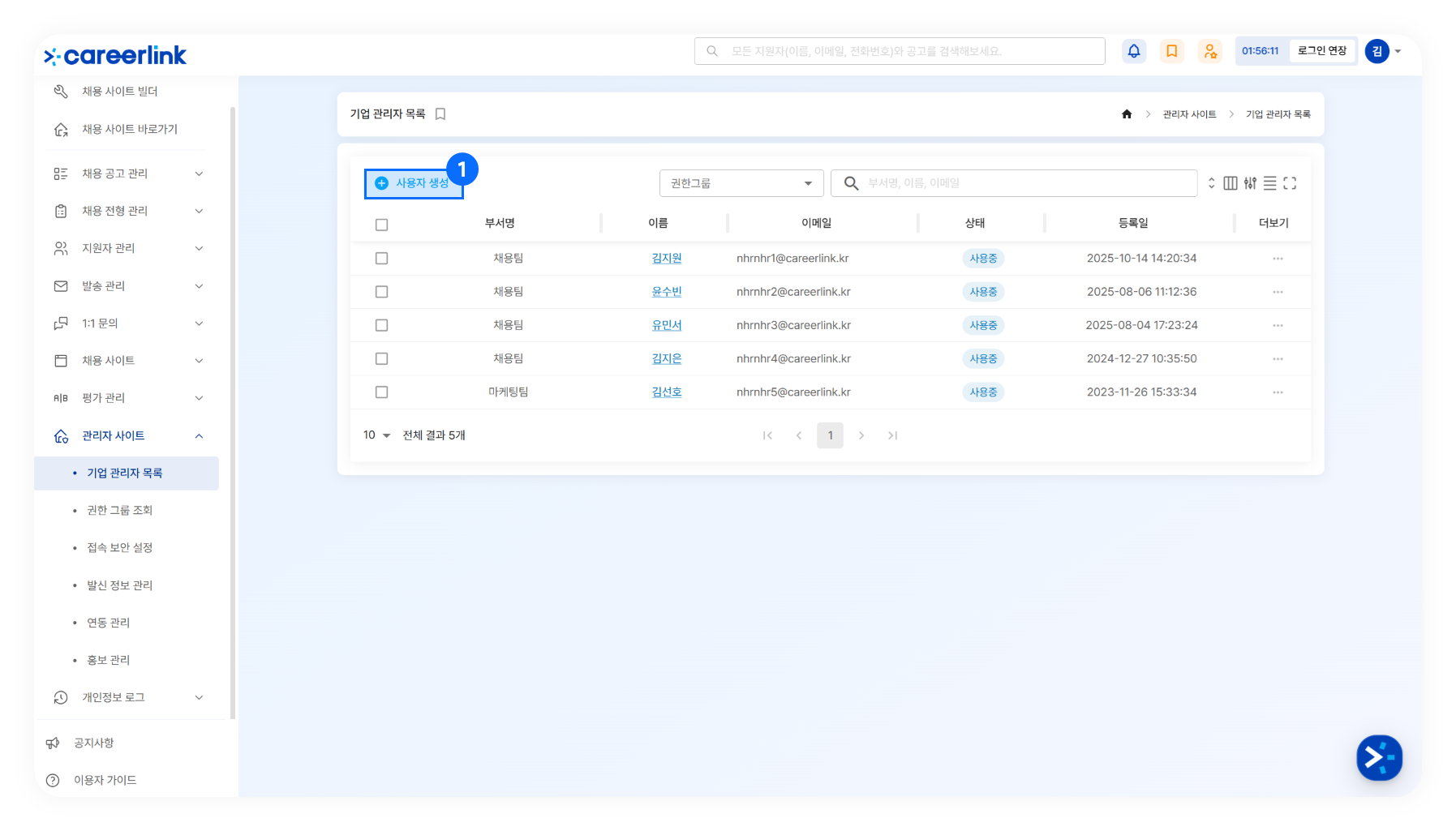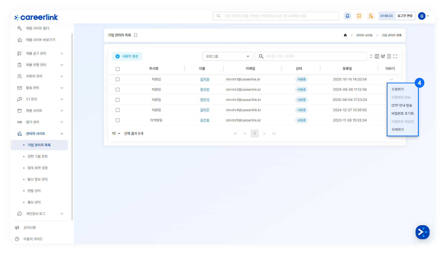 채용 사이트의 관리자 목록을 관리할 수 있습니다. 관리자는 계열사 관리자, 관리자, 평가자, 문의 담당자 등 역할에 따라 권한을 다르게 부여하여 관리할 수 있습니다.