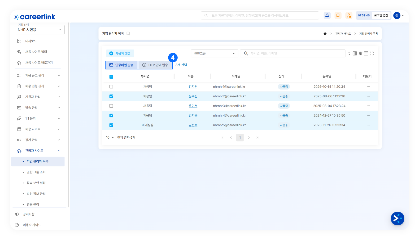 사용자 생성 이후, 여러 명의 관리자에게 일괄 인증 메일 발송 및 OTP 안내를 발송할 수 있습니다.