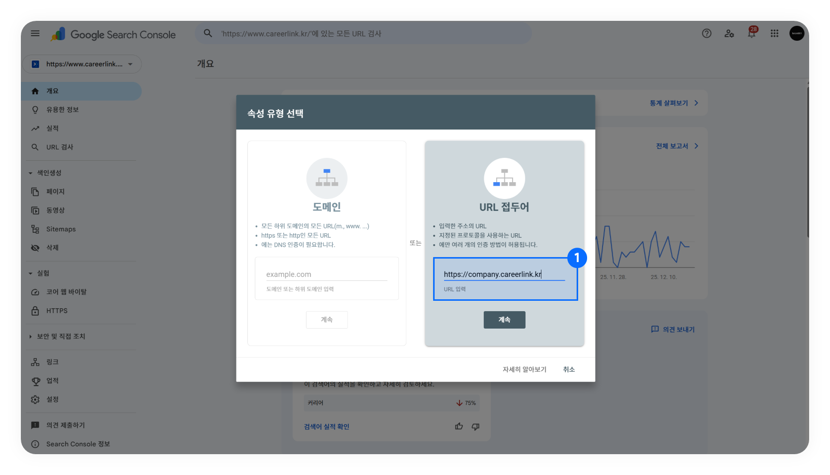 ➊ 구글 서치콘솔(Google Search Console)에 접속하여 URL 접두어를 선택합니다.