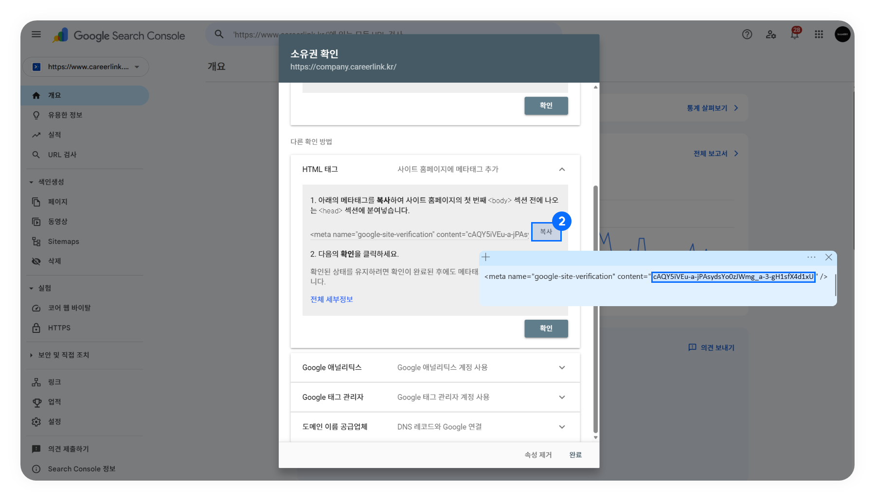 ➋ 소유권 확인 창에서 'HTML 태그'를 선택하고 content에 해당하는 값을 복사해 주세요.