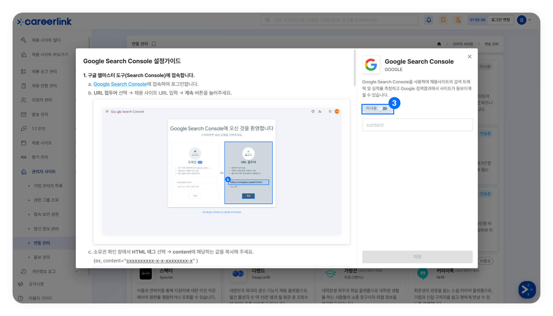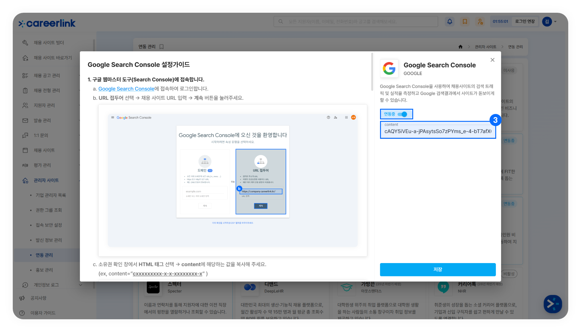 ➌ [관리자 사이트] → [연동 관리]에서 'Google Search Console'을 클릭해 '연동중'으로 상태를 변경하고, content를 붙여 넣은 후, '저장'을 클릭합니다.