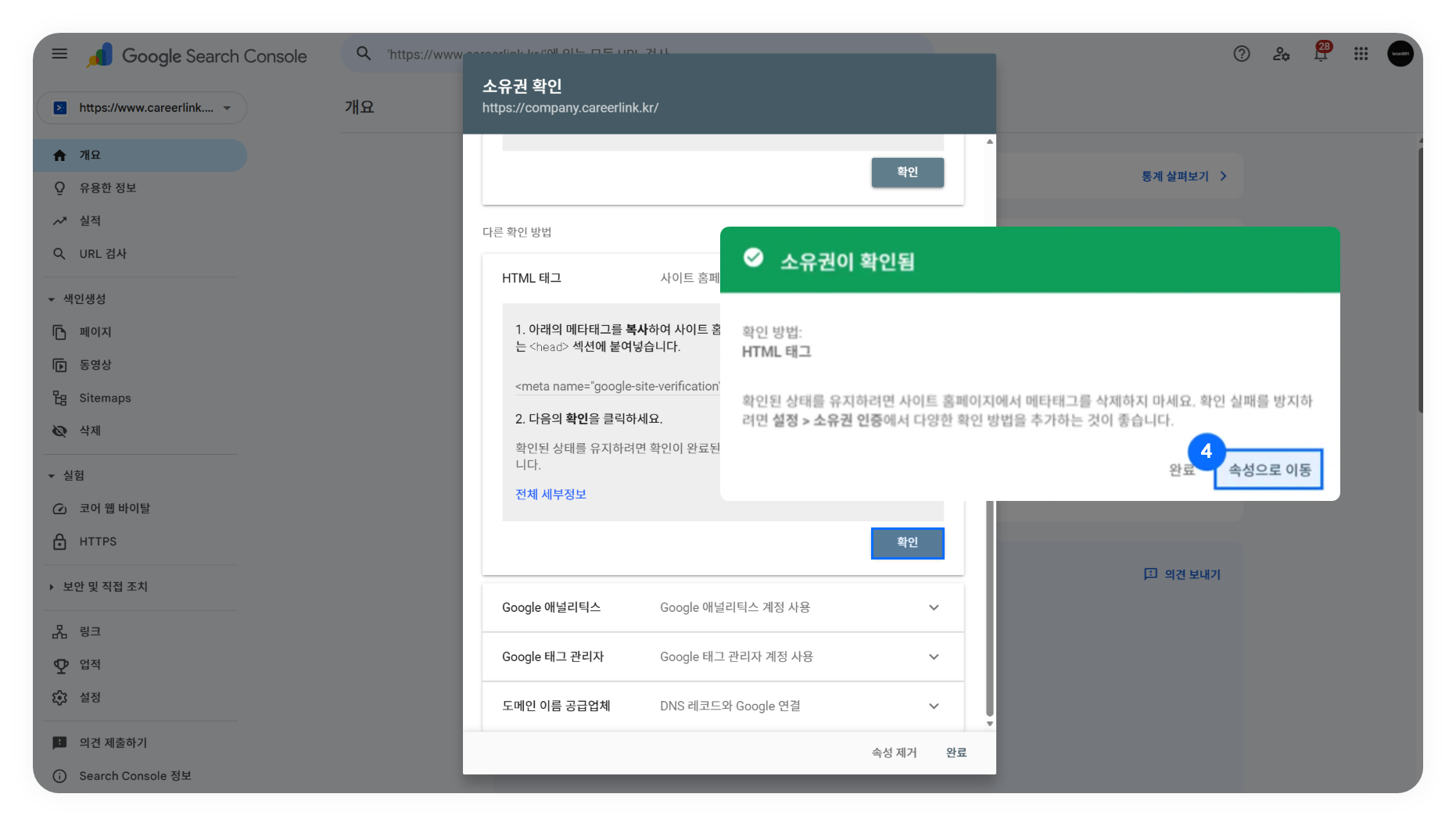 ➍ 구글 서치콘솔에 다시 접속하여 HTML 태그 '확인' 클릭 후, '속성으로 이동'을 클릭합니다.