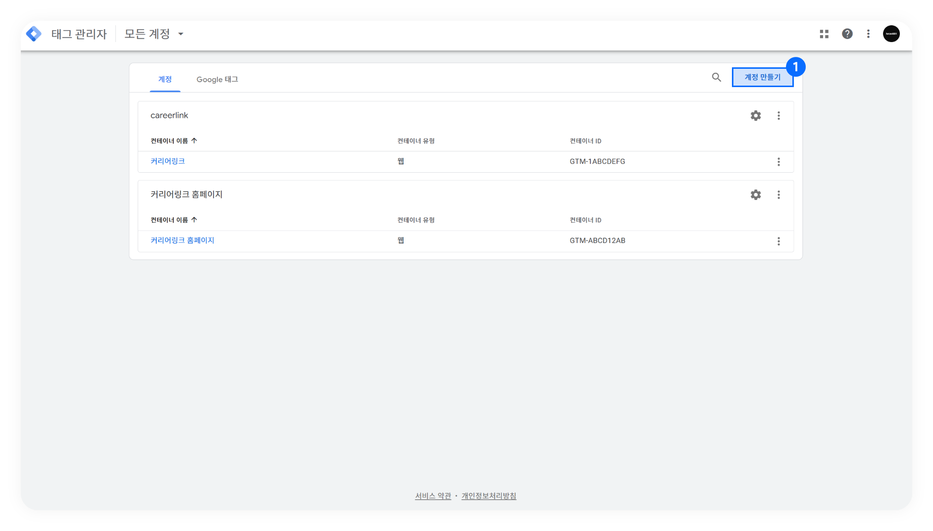 계정 이름 : 구글 태그매니저의 계정명 (예 : NHR)