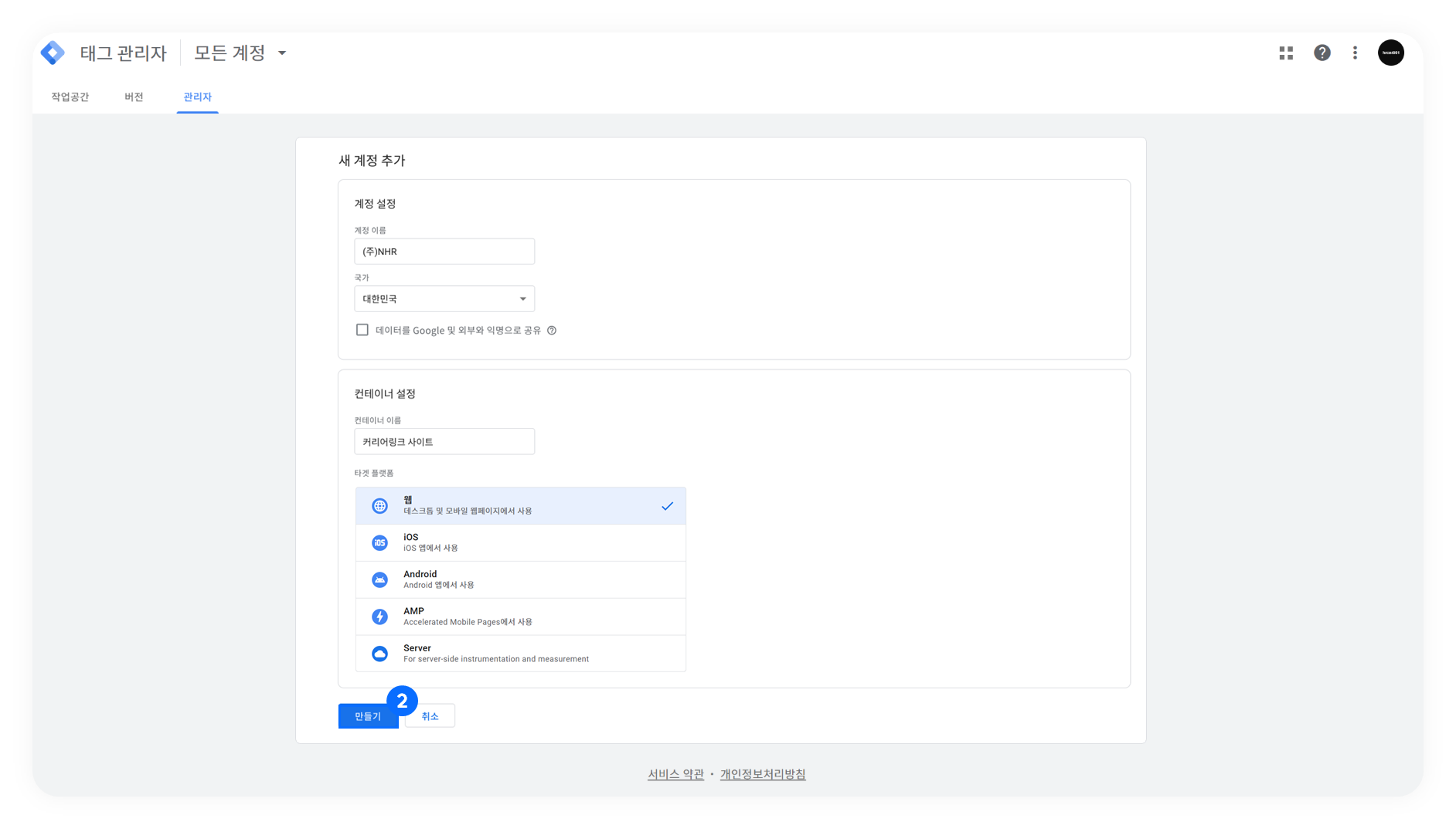 ❷ 계정 이름, 국가, 컨테이너 이름, 타겟 플랫폼을 선택 후, '만들기'를 클릭합니다.