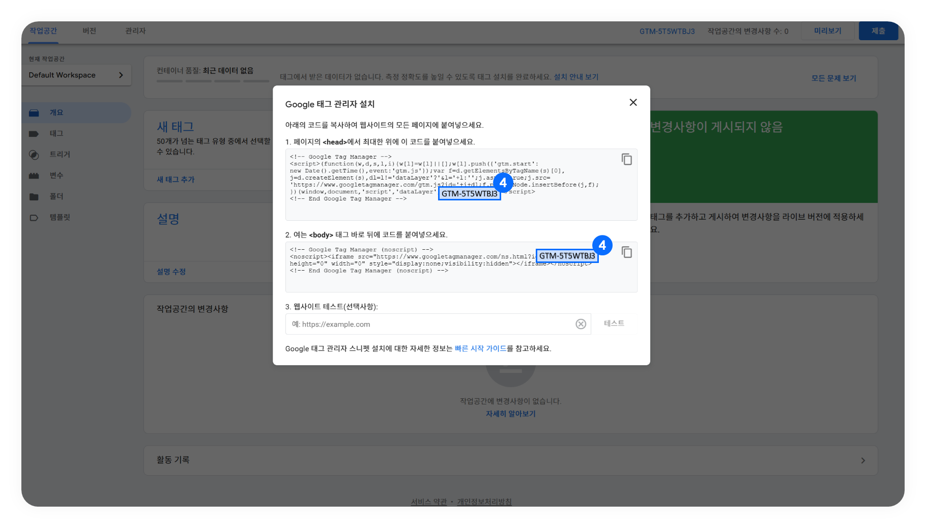 (컨테이너 코드는 ‘GTM-AAAAAAAA’ 와 같은 형식으로 이루어져 있습니다.)