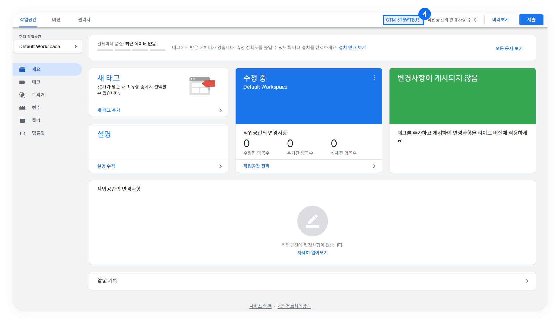 해당 내용은 구글 태그매니저 관리자 페이지 우측 상단에서도 확인하실 수 있습니다.
