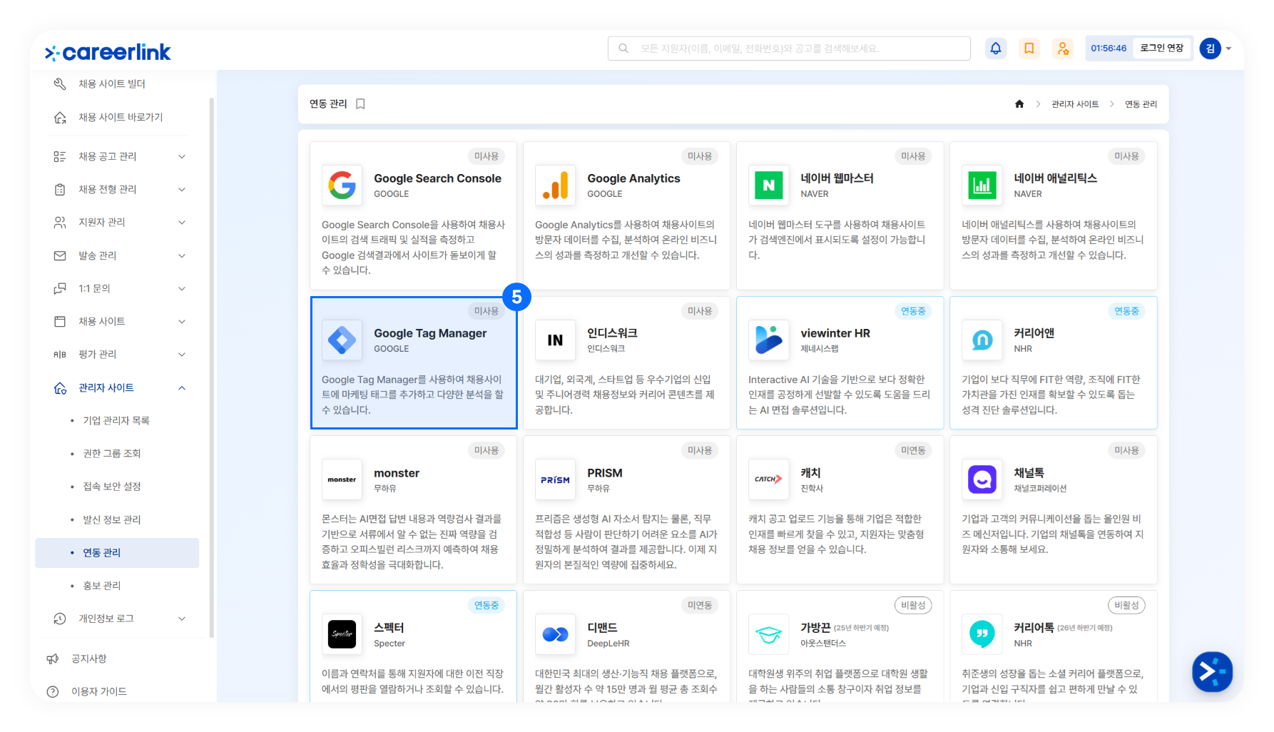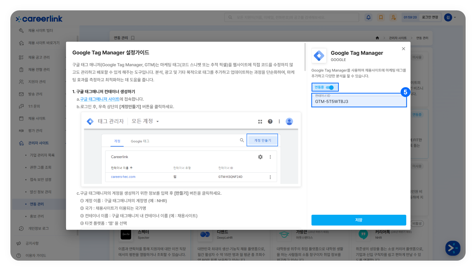 ❺ [관리자 사이트] → [연동 관리]에서 'Google Tag Manager'를 클릭해 '연동중'으로 상태를 변경하고, 컨테이너 ID를 붙여 넣은 후, '저장'을 클릭합니다.