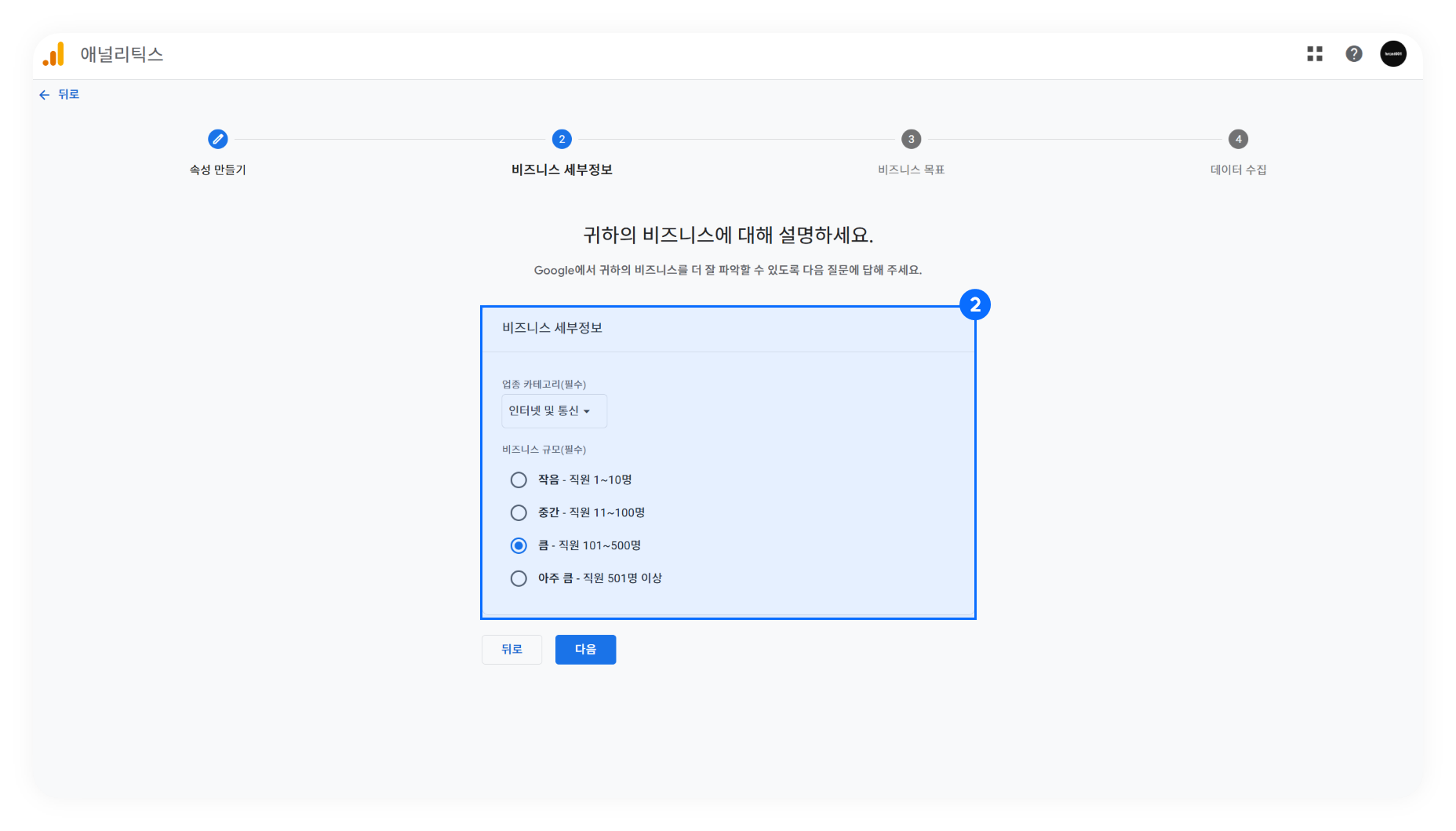 ➋ 해당하는 업종 카테고리 및 비즈니스 규모를 선택합니다.