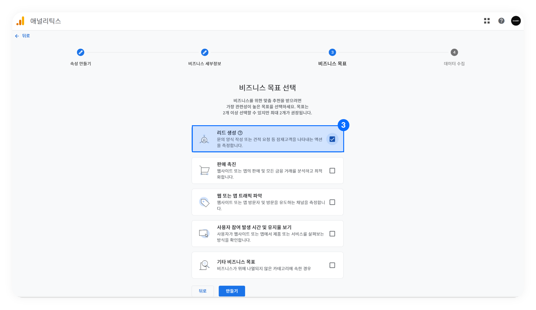 ➌ 비즈니스 목표는 '리드 생성'으로 설정하시는 것이 좋습니다.