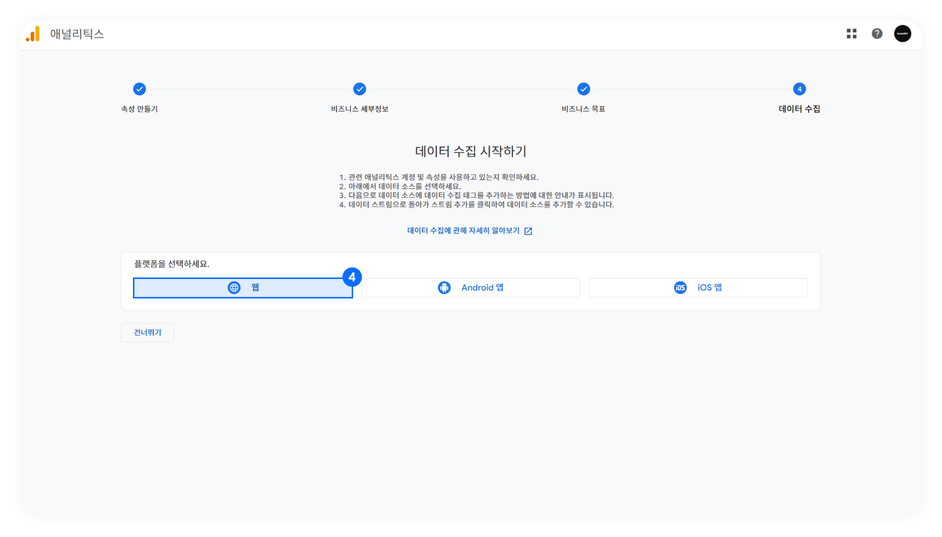 ➍ 수집 플랫폼은 '웹' 으로 선택합니다.
