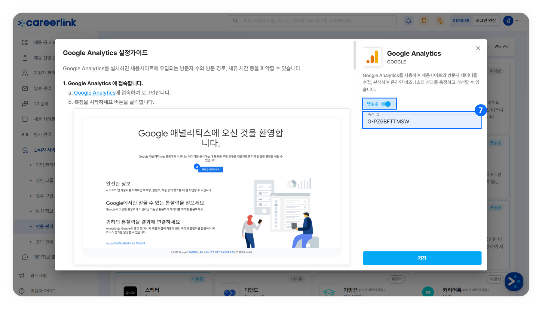 ➐ [관리자 사이트] → [연동 관리]에서 'Google Analytics'를 클릭해 '연동중'으로 상태를 변경하고, 측정 ID를 붙여 넣은 후, '저장'을 클릭합니다.