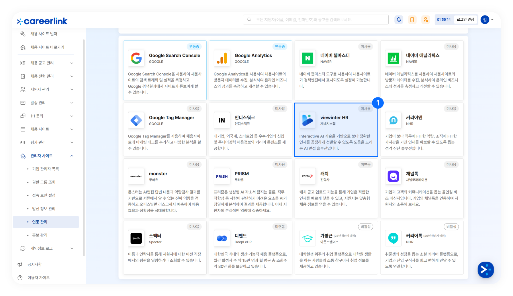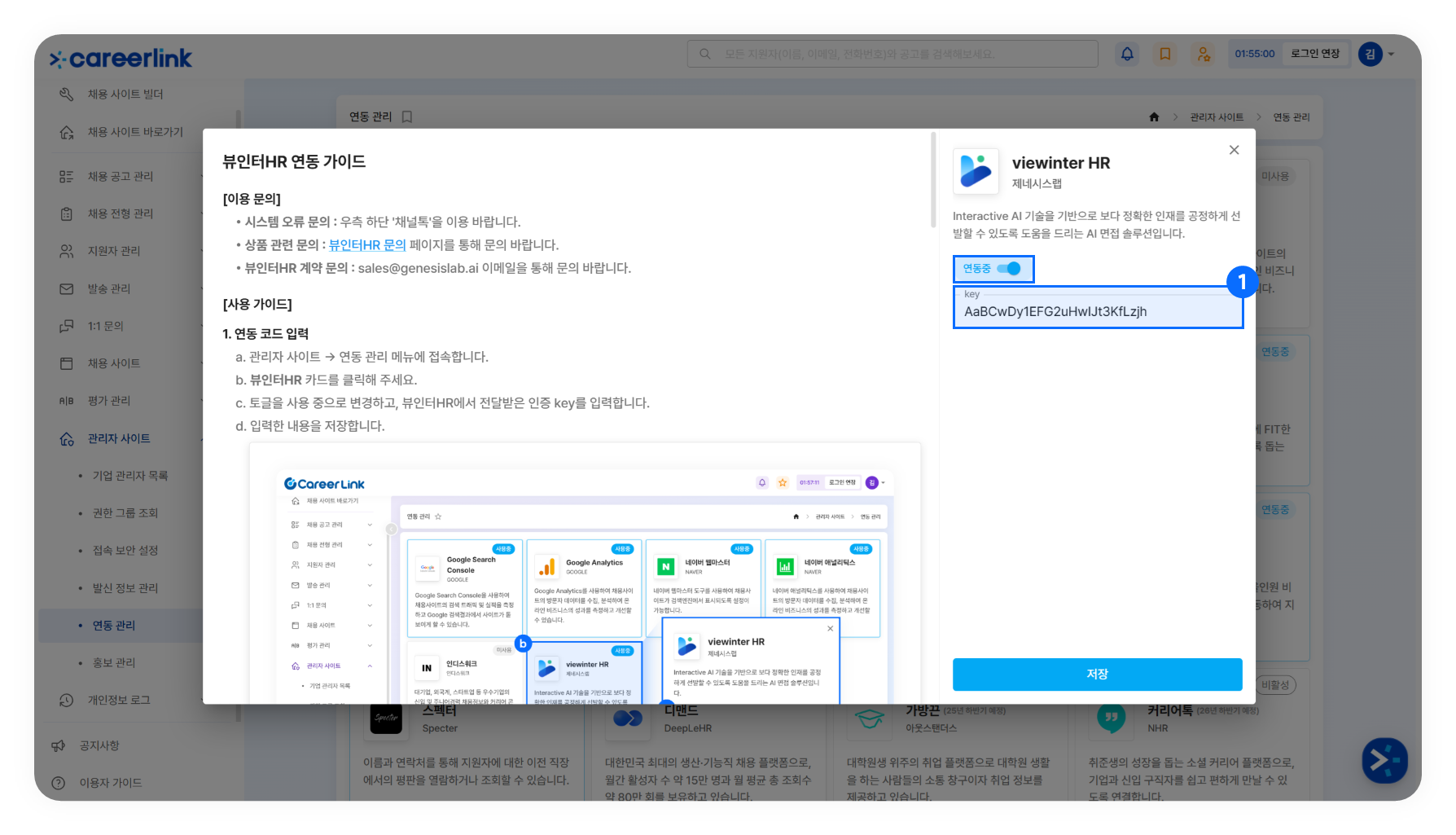 ➊ [관리자 사이트] → [연동 관리]메뉴에서 '뷰인터HR'을 클릭해 '연동중'으로 상태를 변경하고 뷰인터HR에서 전달받은 key를 입력 후, '저장'을 클릭합니다.