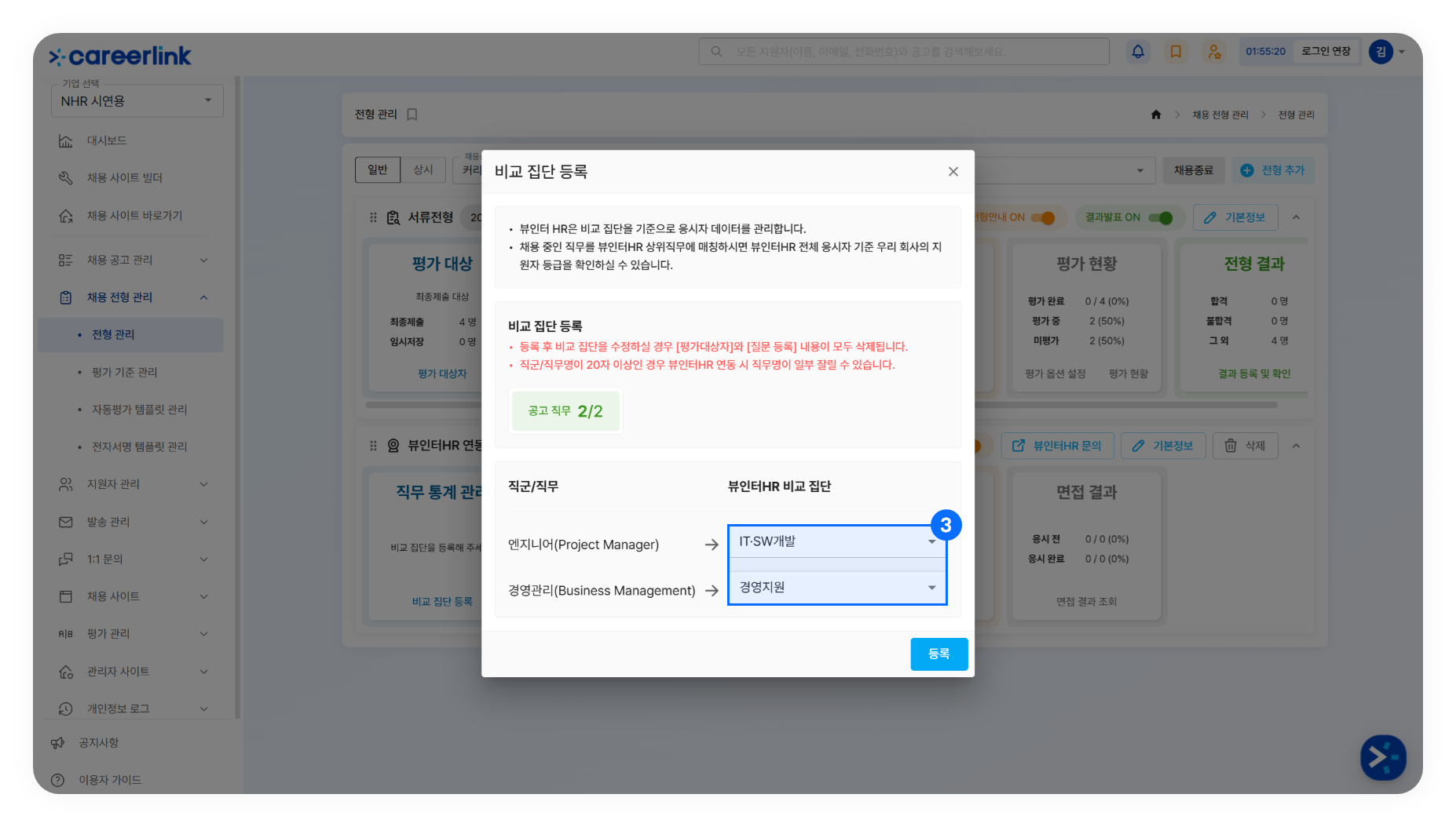 ➌ [비교 집단 등록] 화면에서 채용 중인 직군/직무에 맞는 뷰인터HR 비교 집단을 선택합니다.
