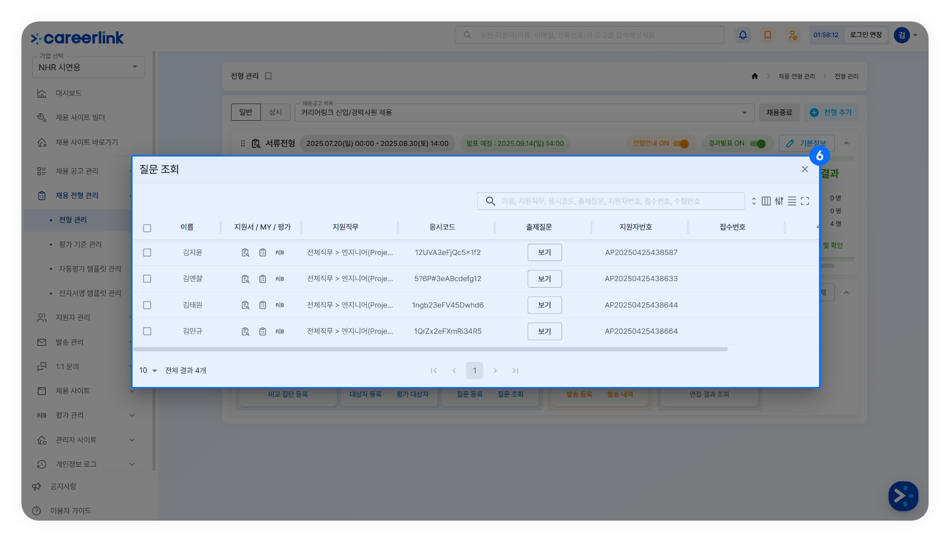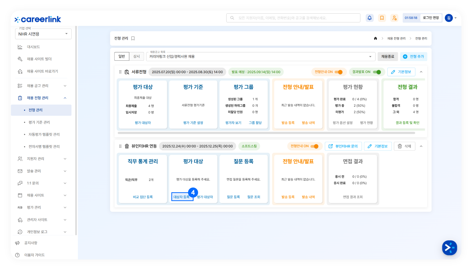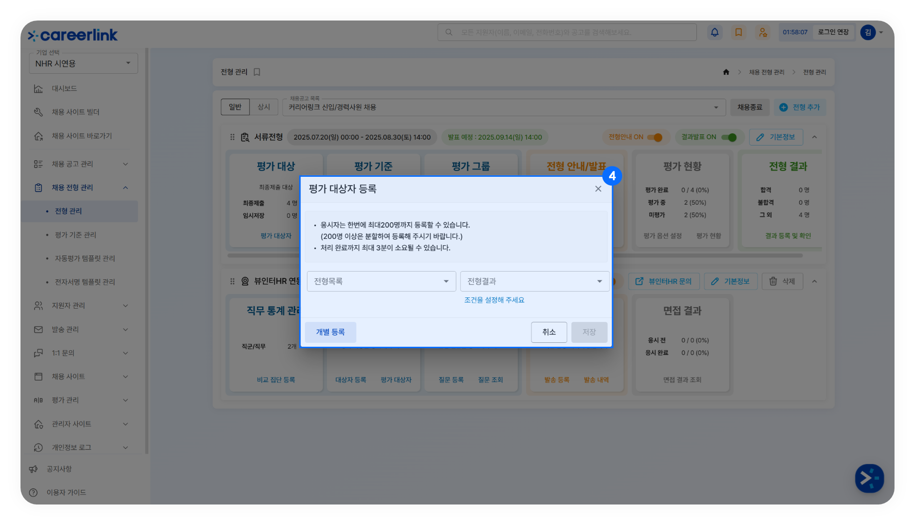 ➍ [대상자 등록] 버튼을 눌러 평가 대상자를 추가합니다. 등록된 지원자는 [평가 대상자] 화면에서 확인하실 수 있습니다.