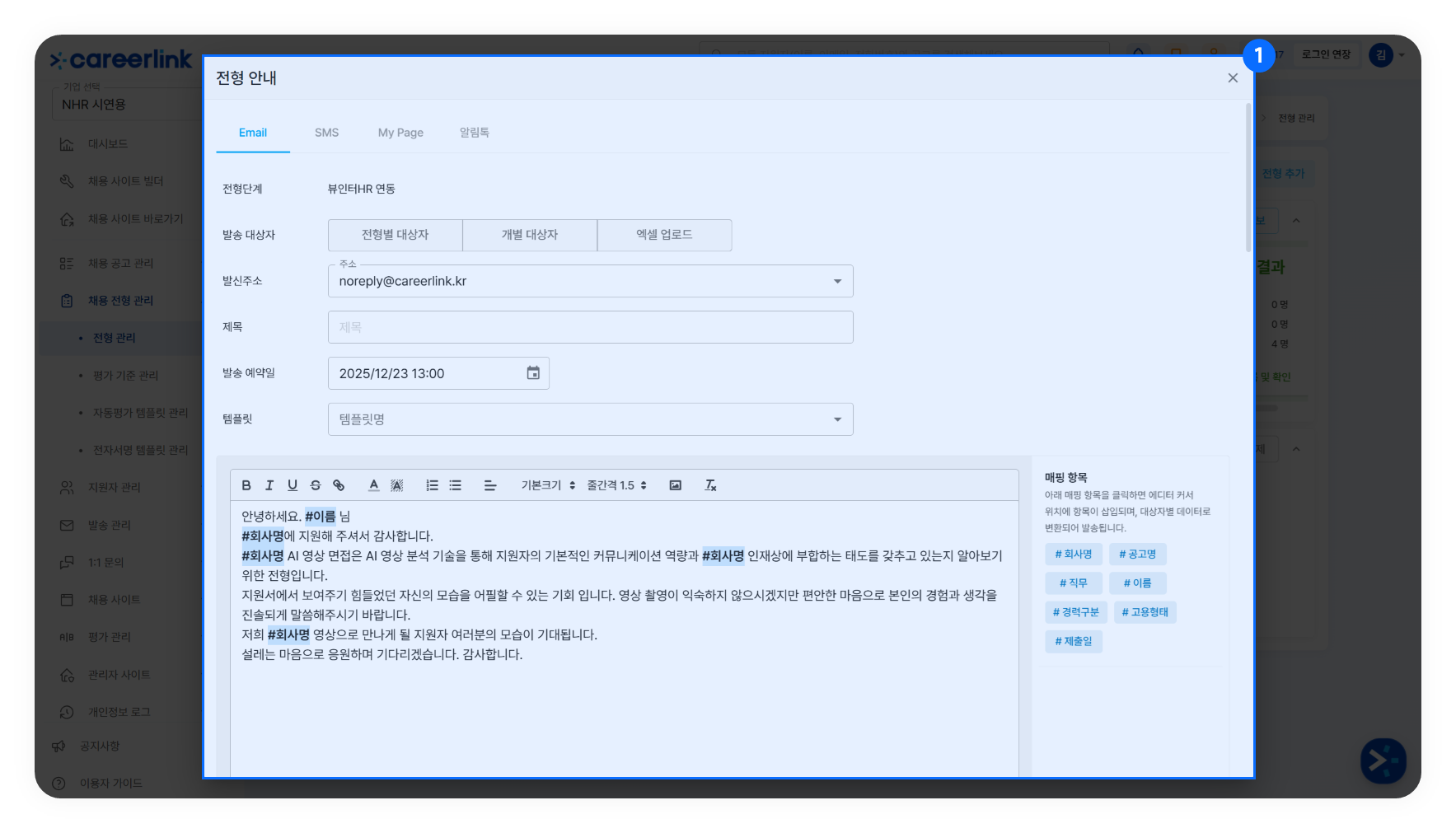 ➊ [발송 등록]에서 지원자에게 E-mail, SMS, My page, 알림톡을 선택하여 면접 응시를 요청하실 수 있습니다.