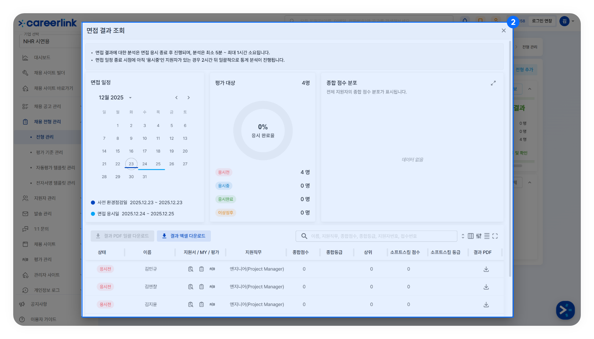 면접 일정 종료 시점에 아직 '응시중'인 지원자가 있는 경우 약 2시간 뒤 일괄적으로 통계 분석이 진행됩니다.