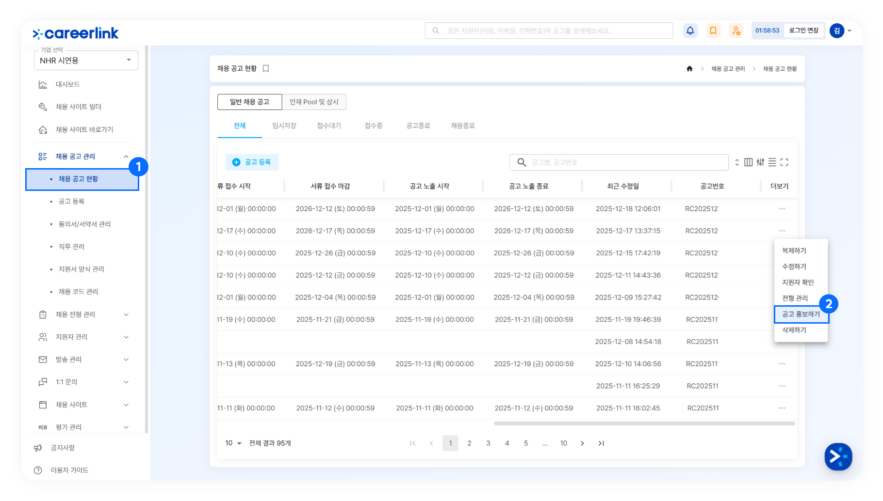 ➊ [채용 공고 관리] → [채용 공고 현황] 메뉴에 접속합니다.