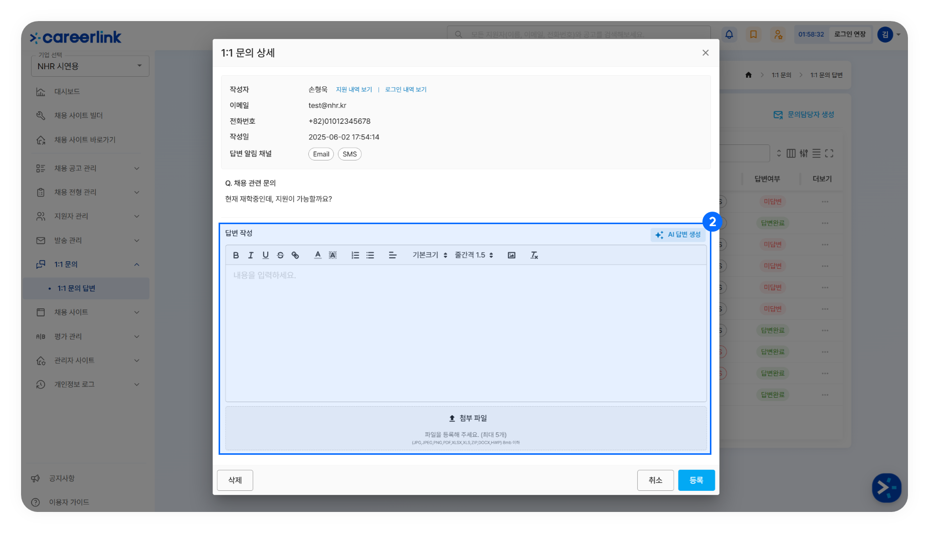 โ ๋ต๋ณ ์ ๋ ฅ ํ [๋ฑ๋ก] ๋ฒํผ์ ํด๋ฆญํฉ๋๋ค. ๋ต๋ณ์ด ์๋ฃ๋ ๊ฒฝ์ฐ ์์ฑ์๊ฐ ์๋ฆผ์ ํฌ๋งํ ์ฑ๋๋ก ์๋ฆผ์ด ๋ฐ์ก๋ฉ๋๋ค.